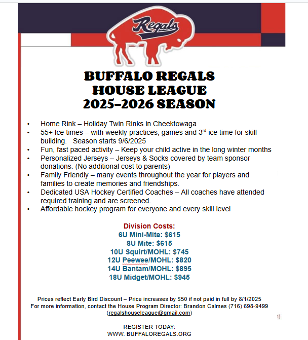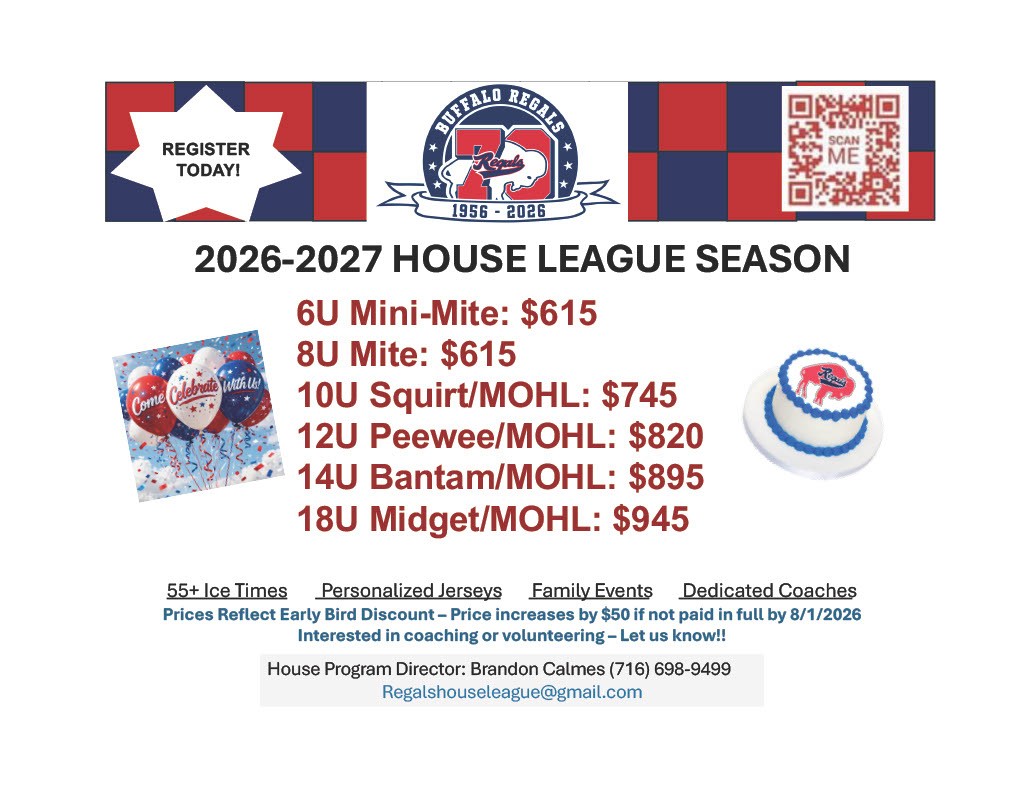 The Buffalo Regals House Program gives players the opportunity to play hockey in a fun, organized, and competitive environment. Our organization prides itself on developing our players' skills and hockey IQ through team practices, skill clinics, and gameplay. We cater to boys and girls ages 4-18.